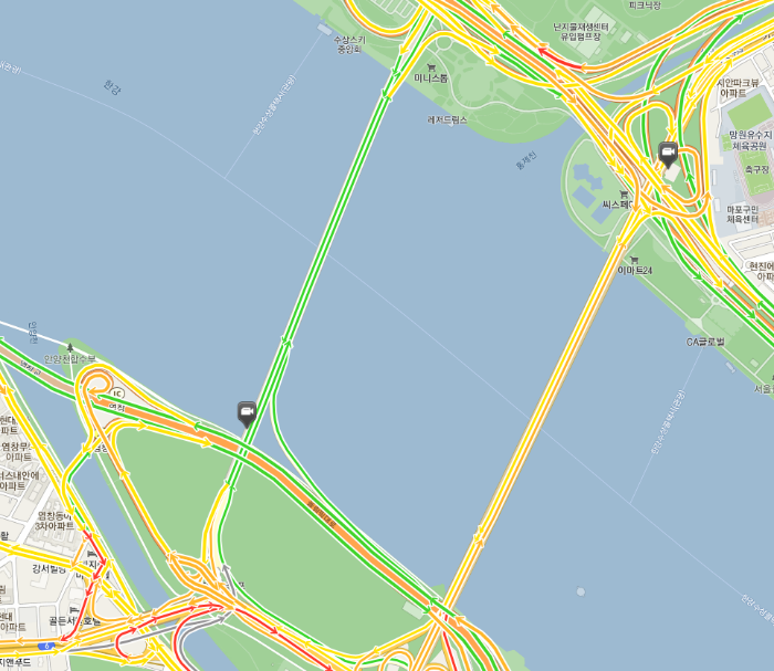 월드컵대교 상부를 비치는 CCTV는 없어서 확인이 불가능하지만, 서울경찰청 종합교통정보센터에서의 교통 상황을 보면 전부 원활한 상태로 표시가 되고 있습니다. 즉, 월드컵대교는 원활한 흐름을 보여주는 것입니다.