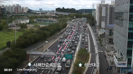 아래 사진은 성산대교와 월드컵대교 남단에서 금천IC (서해안고속도로)로 내려가는 남쪽 방면의 CCTV 모습입니다. 옆으로 기존 서부간선으로 가려는 차량과 서부간선도로 전구간을 관통하기 위해 지하도로로 가는 차량들이 비슷합니다.
