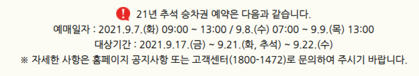 2021 추석 기차표 예매 상세
